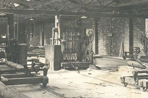 Entstehung eines Dampfsägewerkes in Neuss mit bis zu 100 Arbeitern.